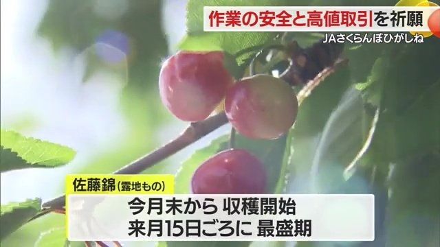 一方、露地もののサクランボの出荷シーズンを前に、21日、佐藤錦発祥の地・東根市で生産者や市場関係者が参加して、JAさくらんぼひがしねの祈願祭が行われた。