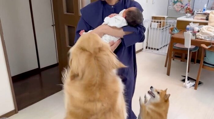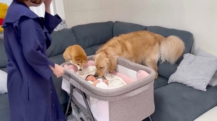 「生後0ヶ月の赤ちゃんと初対面を果たした豆柴とゴールデンレトリバーの反応が可愛すぎました...!」とのコメントともに投稿されたのは、赤ちゃんを見つめる犬2匹の写真。