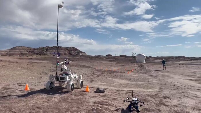 宇宙飛行士の補助を想定し、模擬宇宙船をローバーでメンテナンスする。