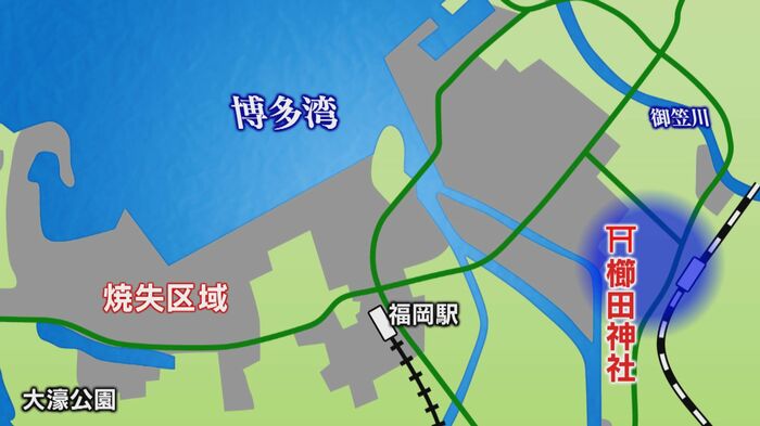 この道があったため、福岡大空襲では、櫛田神社や住んでいた冷泉町周辺は、火の手から逃れることができたという。