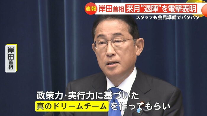 14日午前、岸田首相の緊急会見が始まるわずか9分前には、スタッフが会見の準備に大わらわとなった。なんとか準備が整ったわずか5分後に、岸田首相が登壇。「総裁選を通じて選ばれた新たなリーダーを、一兵卒として支えていくことに徹してまいります」と述べ、自ら身を引く考えを明らかにした。