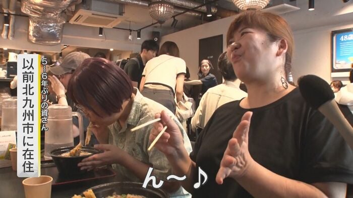 そして、いよいよ箸を付ける。大分出身で資さんファン歴20年という男性は「あー、やっぱこれだ。ゴボウそのまま揚げてるから、これは。ゴボウ本来の味でそのものの味を楽しめる」と感嘆の声をあげ、北九州市在住の過去があり5~6年ぶりの資さんとなる女性は「ん~、この味。肉の感じもこんな感じだった」と懐かしい味に思わず唸る。