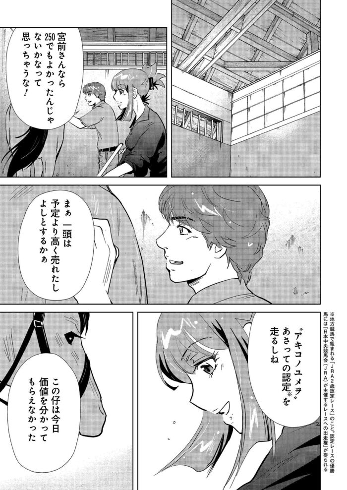 サラブレッドを売るなら大切に使ってくれる馬主に…“主取り”を選んだ生産牧場が願うのは兄弟馬の認定レース優勝 マンガ『会社をやめて馬主やります! アキコノユメヲ』(第28話・後編) 信田朋嗣 栗元健太郎/咲 2024年9月2日 月曜 午前7:01 #1 … #55 #56 #57 … #80 次ページこの仔の価値を証明できるのはーー 1 2 3 4 5 #1 … #55 #56 #57 … #80 【よく一緒に読まれている記事】 【初めから読む】“サラリーマン馬主”も夢じゃない!会社を辞め、「ただいま」と競走馬を生産する実家に戻ってきた娘… 信田朋嗣,栗元健太郎/咲の他の記事 2歳馬の身体にとって実は厳しい調教と遠征…その判断の重さに馬主が耐えるために必要な“声” エンタメ 2024年11月25日 2歳牝馬で全治6ヶ月の怪我…馬主が考える“パンク”した馬の転売・放牧・引退、そして殺処分という4つの選択肢 エンタメ 2024年11月25日 2歳牝馬にとって度重なる遠征は体の負担が大きい…それでも狙いたいグランダム・ジャパンで勝利する価値 エンタメ 2024年11月18日 重賞を勝利した馬が次に狙うレースの意味。2歳牝馬がグランダム・ジャパンを狙って見える景色とは エンタメ 2024年11月18日 一覧ページへ