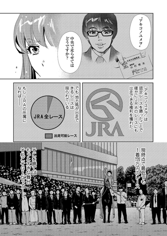 馬主が選ぶべきは“金”か“信頼”か…地方競馬で認定レースを勝利してJRAから声をかけられた時に考えること マンガ『会社をやめて馬主やります! アキコノユメヲ』(第30話・前編) 信田朋嗣 栗元健太郎/咲 2024年9月16日 月曜 午前7:00 #1 … #58 #59 #60 … #80 次ページ帰路で姉弟は言い合いに… 1 2 3 4 5 #1 … #58 #59 #60 … #80 【よく一緒に読まれている記事】 馬主の選択の“重さ”は計り知れない…一つの決断が調教師、厩務員、ジョッキー、生産牧場の生活を一変させる怖さ 信田朋嗣,栗元健太郎/咲の他の記事 2歳馬の身体にとって実は厳しい調教と遠征…その判断の重さに馬主が耐えるために必要な“声” エンタメ 2024年11月25日 2歳牝馬で全治6ヶ月の怪我…馬主が考える“パンク”した馬の転売・放牧・引退、そして殺処分という4つの選択肢 エンタメ 2024年11月25日 2歳牝馬にとって度重なる遠征は体の負担が大きい…それでも狙いたいグランダム・ジャパンで勝利する価値 エンタメ 2024年11月18日 重賞を勝利した馬が次に狙うレースの意味。2歳牝馬がグランダム・ジャパンを狙って見える景色とは エンタメ 2024年11月18日 一覧ページへ