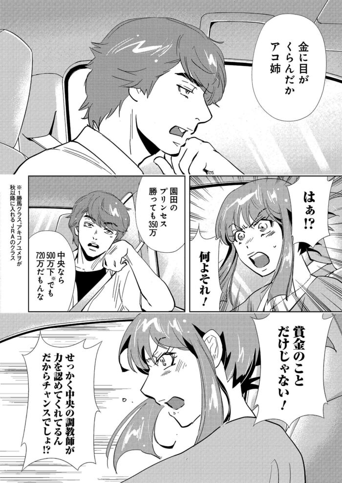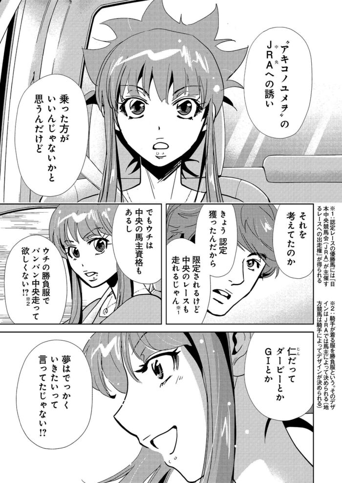 馬主が選ぶべきは“金”か“信頼”か…地方競馬で認定レースを勝利してJRAから声をかけられた時に考えること マンガ『会社をやめて馬主やります! アキコノユメヲ』(第30話・前編) 信田朋嗣 栗元健太郎/咲 2024年9月16日 月曜 午前7:00 #1 … #58 #59 #60 … #80 次ページ中央への道は拓けたんだ…! 1 2 3 4 5 #1 … #58 #59 #60 … #80 【よく一緒に読まれている記事】 馬主の選択の“重さ”は計り知れない…一つの決断が調教師、厩務員、ジョッキー、生産牧場の生活を一変させる怖さ 信田朋嗣,栗元健太郎/咲の他の記事 2歳馬の身体にとって実は厳しい調教と遠征…その判断の重さに馬主が耐えるために必要な“声” エンタメ 2024年11月25日 2歳牝馬で全治6ヶ月の怪我…馬主が考える“パンク”した馬の転売・放牧・引退、そして殺処分という4つの選択肢 エンタメ 2024年11月25日 2歳牝馬にとって度重なる遠征は体の負担が大きい…それでも狙いたいグランダム・ジャパンで勝利する価値 エンタメ 2024年11月18日 重賞を勝利した馬が次に狙うレースの意味。2歳牝馬がグランダム・ジャパンを狙って見える景色とは エンタメ 2024年11月18日 一覧ページへ