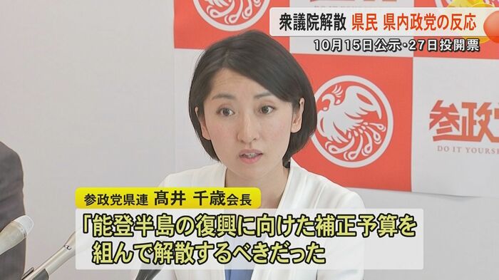 また、参政党県連の髙井千歳会長は「能登半島の復興に向けた補正予算を組んで解散するべきだった。国民の生活よりも政局のための解散。参政党は、国民の暮らしに寄り添った政党であると訴えていきたい」としている。