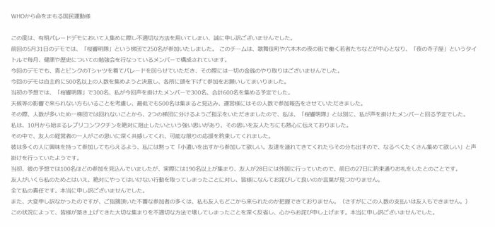 このデモ集会を主催した団体「WHOから命をまもる国民運動」は当日の取材に対し、サクラ募集への関与を否定した。その上で騒動後、公式ホームページで共同代表名義の声明文を公表した。その中に、こうした記載があった。