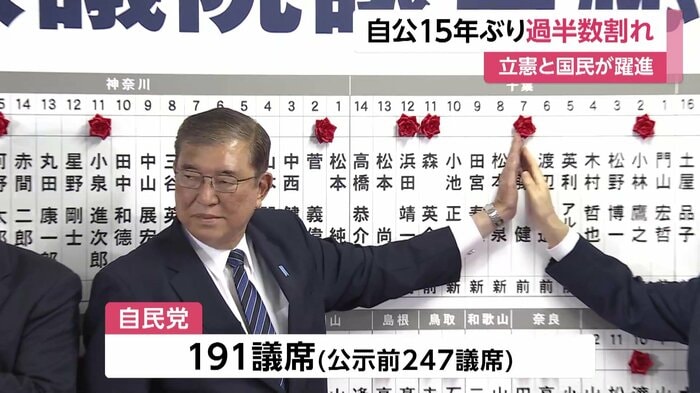 自民党は、いわゆる裏金問題などへの批判が大きな逆風となり、公示前の247議席から56減らし、191議席となった。