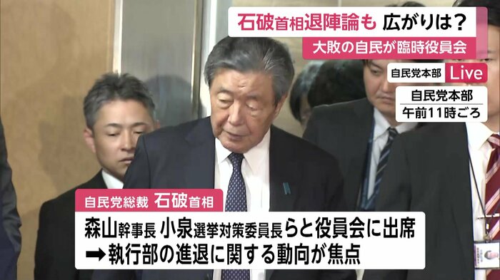 石破首相は午前11時ごろ自民党本部に入り、森山幹事長・小泉選挙対策委員長らとともに役員会に出席している。