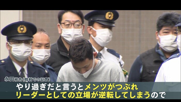 永田被告は、そのときの心境を「正直に言うと、マジかと思いました」と話す一方で、「やり過ぎだと言うと、メンツがつぶれ、リーダーとしての立場が逆転してしまうので、逆に『おー、やるやん!』と褒めました」と、女性が助けを求めても暴行を続け「娘と息子を殺すぞ。家を燃やすぞ」などと脅迫したといいます。