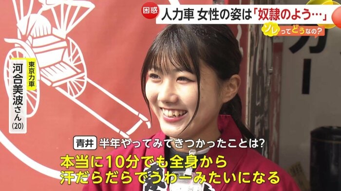 当の女性俥夫の方はどう思っているのか。実際に物議を醸した動画で人力車を引いていた、河合美波さん(20)に話を聞いた。
