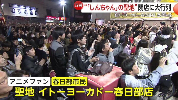 クレヨンしんちゃんファンは「クレヨンしんちゃんのサトーココノカドーが有名なので来ました」、「(Q. 来るのは初めて?)2回ぐらい来てる。この人(父親)と!」「(Q. 春日部に住んでる?)横浜の方から来ました」、「寂しいですね。大事なものがなくなってしまったような、ぽっかりした感覚」と話した。