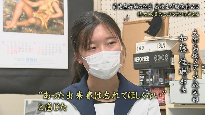 熊本県立大津高校メディア放送部、さまざまなコンテストで受賞歴のある部活が、今回作品の題材に選んだのは、戦時中、菊池市にあった『菊池飛行場』での出来事。TKUの中原アナウンサーの祖母・妙子さん(享年97)の体験だ。