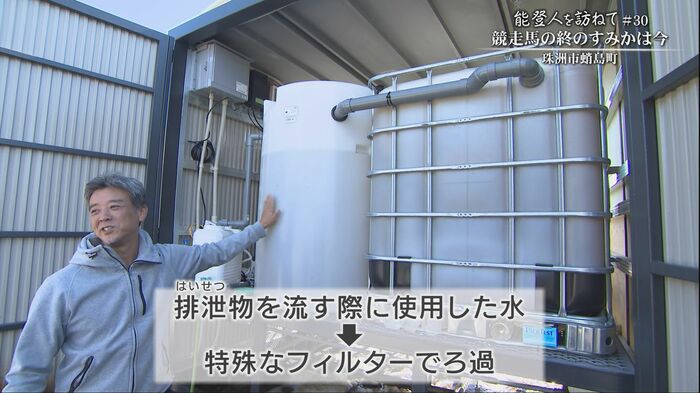 その夢に向かって取り組んでいるのが、「水の循環システム」だ。『珠洲ホースパーク』にあるトイレは、排泄物を流すために使われた水を特殊なフィルターなどを通してろ過させる。その水を再利用することで、トイレはいつでも使えるようになるという。
