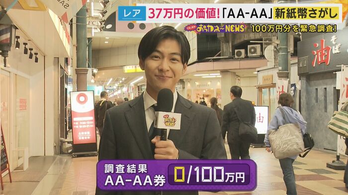 街ゆく人に財布を見せてもらい、新紙幣10枚の中から、『AA―AA券』が何枚あるのかを調査していく。