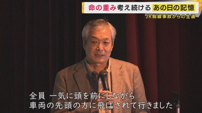 小椋聡さん:私が車両の異常に気付き始めたのは、周囲の乗客の皆さんが尋常じゃな事態だと気づき始めてざわざわしていました。 次の瞬間、車体がねじれるような形で、私の周りに立っていた人たちが全員一気に頭を前にしながら、車両の先頭の方に飛ばされていきました。