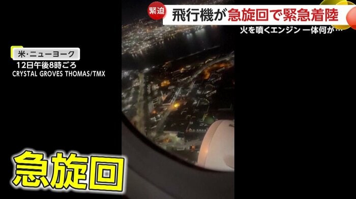 アメリカ・ニューヨークで12日午後8時頃、離陸していく飛行機の窓から撮影されたのは、上空から見える美しい景色ではなく、突然「ボン!」という爆発音とともにエンジンが火を噴く瞬間だ。