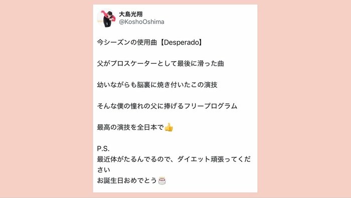 節目の今季、フリーのプログラムに選んだのは、父・淳コーチがプロスケーターとして最後のアイスショーで披露した『Desperado』。
