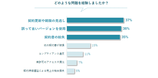 契約更新や期限の見逃し、誤って古いバージョンを使用したり、契約書を紛失するなどの経験がある、と回答。