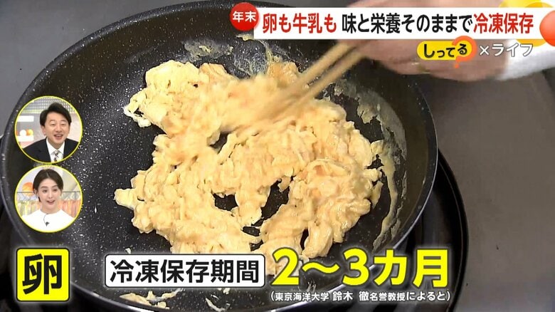 本当に味は落ちないのか。実際に試してみました。まず卵は割って容器に入れて溶き卵にして冷凍保存するといいというです。鈴木先生によると、殻つきのまま冷凍すると、割れてしまうなど使い勝手も悪くなるとのことです。さらに、黄身をもとの柔らかさに戻すのは難しいため、溶き卵にしておくのがオススメだそうです。そして牛乳も、保存容器に入れて冷凍保存できるということです。