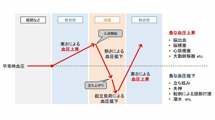 「入浴では暖かい部屋から、寒い脱衣所・浴室に行き、お風呂で温まり、出た後に寒くなる、という状態が繰り返されるので、ヒートショックが起きやすいと言われています」