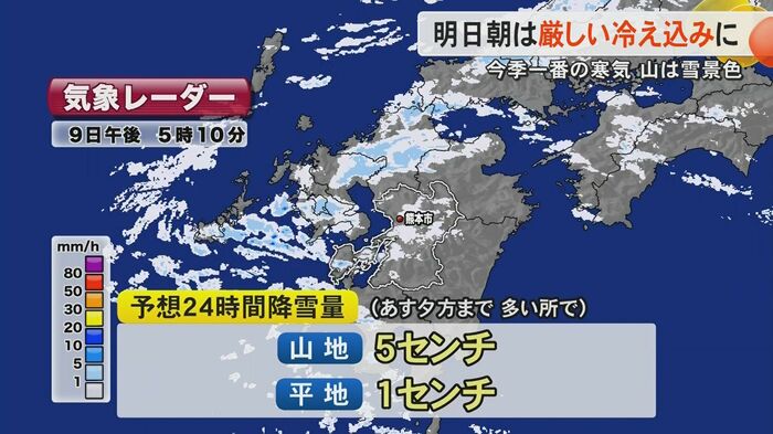 また雪とともに注意が必要なのが厳しい寒さ。10日朝にかけては内陸部を中心に気温が下がり、熊本県内の広い範囲で氷点下3度以下、阿蘇市乙姫は氷点下8度まで冷え込む予想だ。