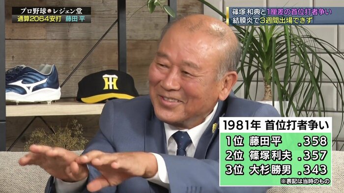 1981年に藤田氏は初めて首位打者を獲得する。巨人の篠塚和典氏と激しい首位打者争いを演じ、先にシーズンを終えた篠塚氏の打率は3割5分6厘7毛、シーズン最終日のダブルヘッダーで規定打席に到達した藤田氏が打率3割5分7厘7毛と、僅か1厘差だった。