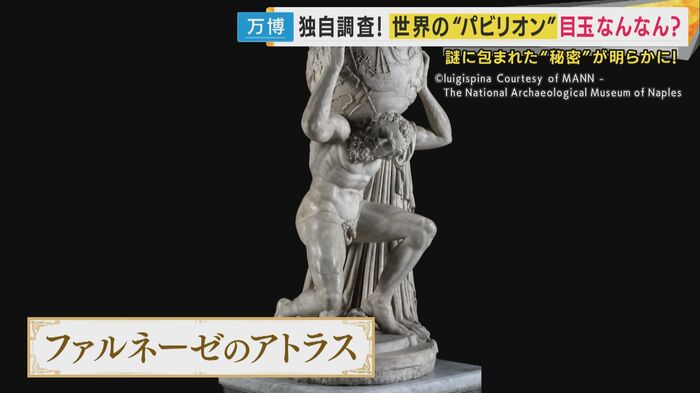 こちらが「イタリア館」で絶対に見てほしいという「ファルネーゼのアトラス」。古代ローマ時代の世界的な文化遺産として知られる大理石の彫刻像だ。 パビリオンのテーマは「ルネサンスの理想の都市」。ギリシャ神話の神アトラスが天球儀を担ぐ力強い像が日本で初めて展示されるということだ。