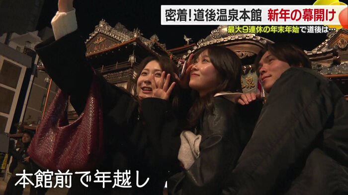 午後11時40分、年明けまで20分となった道後温泉本館前には、続々と人が集まり始めた。公式なカウントダウンイベントは行われなかったものの、地元の人や観光客ら約30人が集まり、2025年の幕開けを祝った。フランスからの観光客も加わり、「HAPPY NEW YEAR!」の声が響く国際色豊かな年越しとなった。ある女性は「2025年はもっと謙虚に生きたいな」と新年の抱負を語った。
