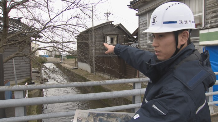 人形寺さんは災害復旧の技術職員として珠洲市に派遣され、被災した河川の復旧工事を担当している。今は、現地調査を終え完成した図面の確認など復旧工事の着工に向けて準備を進めている。「構造的に大丈夫か確認したりとか、図面を作ってそれの基になる数量もあるのでそれぞれ確認して間違いがないかをいま確かめているところですね」