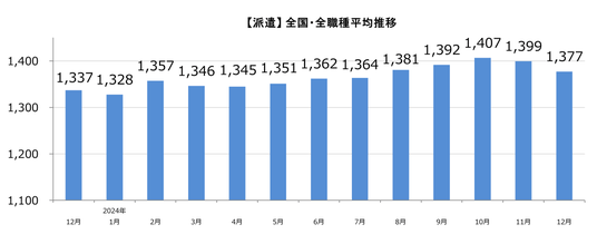 【派遣】全国・全職種平均時給は1,377円。前月比-22円。前年同月比+40円