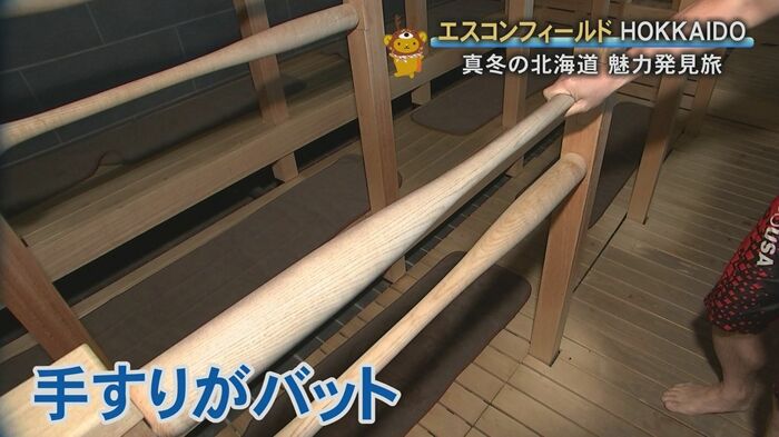 温泉につかった後は、なんとサウナまであり、芸が細かいところが、手すりまでバットの形になっている。整いながらのんびりと野球観戦、日頃の疲れも吹き飛びそうだ。