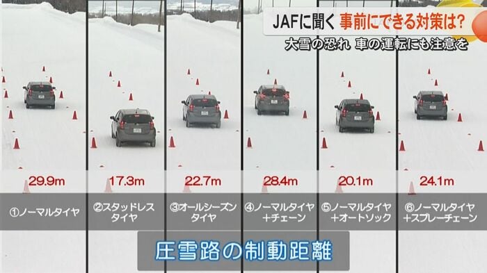 JAFが公開している検証動画では、雪が踏み固められた道路と凍結した路面で急ブレーキを踏んだ時に、車が完全に停止するまでの距離をタイヤごとに比較している。