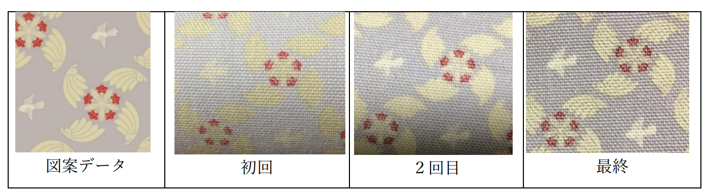 家紋の柄はとても細かく、8号帆布に細部を再現することが非常に難しいのですが、社長が「今までに見たことがない面白い柄」と言って下さり、挑戦してみて下さることになりました。一番難しかったのは「羽根団扇と竜胆と鳥」という柄です。竜胆の周りを羽根団扇が囲み、その柄と柄の間に鳥が飛んでいます。羽根団扇の間の細かい線や、竜胆のガクの線、鳥の羽の繊細な羽毛など、難易度が高く、初回の試作は惨憺たるものでした。色も違い細かい線はほとんど出ていません。
