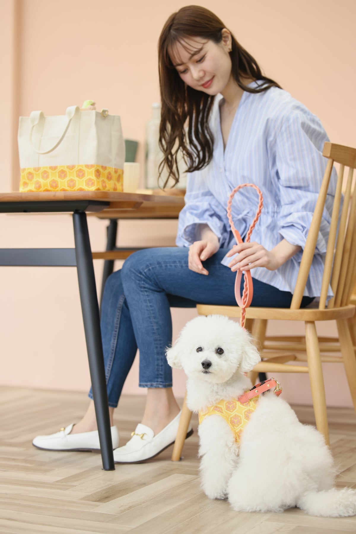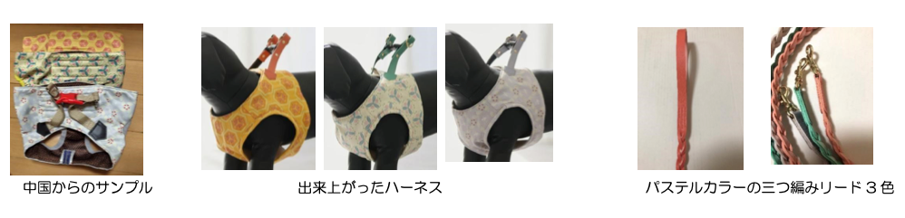そこでリードの生産をお願いしていた革工房にお願いしたところ、ハーネスもサンプルを作って頂けることになり、バッグで使用する内布のオックス生地を使い、革のベルトをリードと同じ革にすることで高級感のあるものが仕上がりました。リードは本革のパステルカラーという他ではあまり見ない色をハーネスに合わせて選び、3つ編みにして可愛さを表現しました。職人さんが1本1本手作りしています。