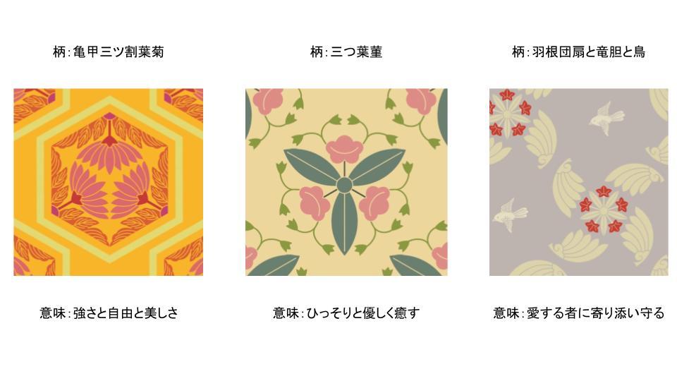 私がオリジナルのバッグを作る事を考えた時に、真っ先に浮かんだのがBotanical Ango(東京都渋谷区)の柄でした。Botanical Angoの柄は家紋をベースにしたモチーフをパターン化し、カラフルにすることで和洋折衷のような独特の世界観があります。インパクトがあり、家紋がベースになっている為1つ1つに意味があります。今回選んだ柄は3つ、「亀甲三ツ割葉菊」と「三つ葉菫」、「羽根団扇と竜胆と鳥」です。