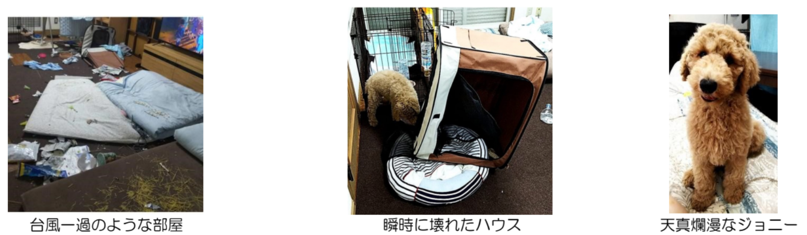 2018年、「大型犬はおとなしくて飼いやすい」と主人に言われ、スタンダードプードルを飼う事になったのがストーリーの始まりです。わんぱくでも元気ならいいと、イタズラ好きのところは目をつむり生後2か月のオスを迎え入れ、ジョニーと名付けました。ところが主人の言葉とはうらはらに、仕事を終えて帰宅すると部屋は散らかり放題。ハウスは初日にファスナーを壊して脱出し、咥えて振り回す玩具と化し、ケージは乗り越えキッチンにも入り、食材や食器、調理器具も破壊のやりたい放題。甘噛みで傷だらけになりながら掃除、食事をさせてお散歩という毎日になりました。