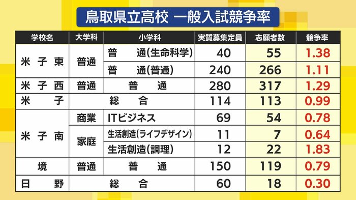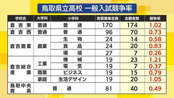 競争率が最も高いのは、米子南の家庭学科・生活創造科調理コースの1.83倍で、最も低いのが、鳥取湖陵の農業学科緑地デザイン科の0.13倍でした。