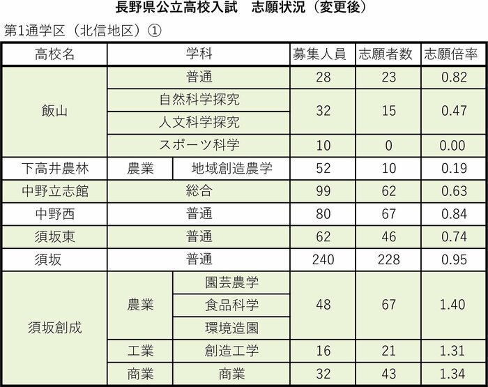 第1通学区(北信地区)の飯山、下高井農林、中野立志館、中野西、須坂東、須坂、須坂創成、北部、長野吉田、長野、長野西、長野商業、長野東、長野工業、長野西中条校、篠ノ井犀峡校、市立長野、長野南、篠ノ井、更級農業、松代、屋代、屋代南、坂城の志願状況は次の通り。