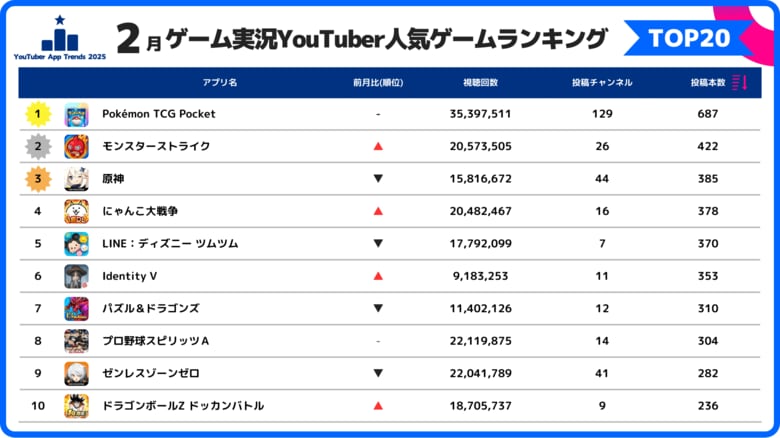また、トップ10内で特に注目されるのは『ドラゴンボールZ ドッカンバトル』の急上昇です。2月16日に開催された10周年記念イベント「ドッカンフェス×頂・伝説降臨祭」の影響で動画投稿が急増し、視聴回数も1,200万回以上増加。イベントと同時に追加された新SSRキャラクターの実況・解説動画が活発に投稿されました。