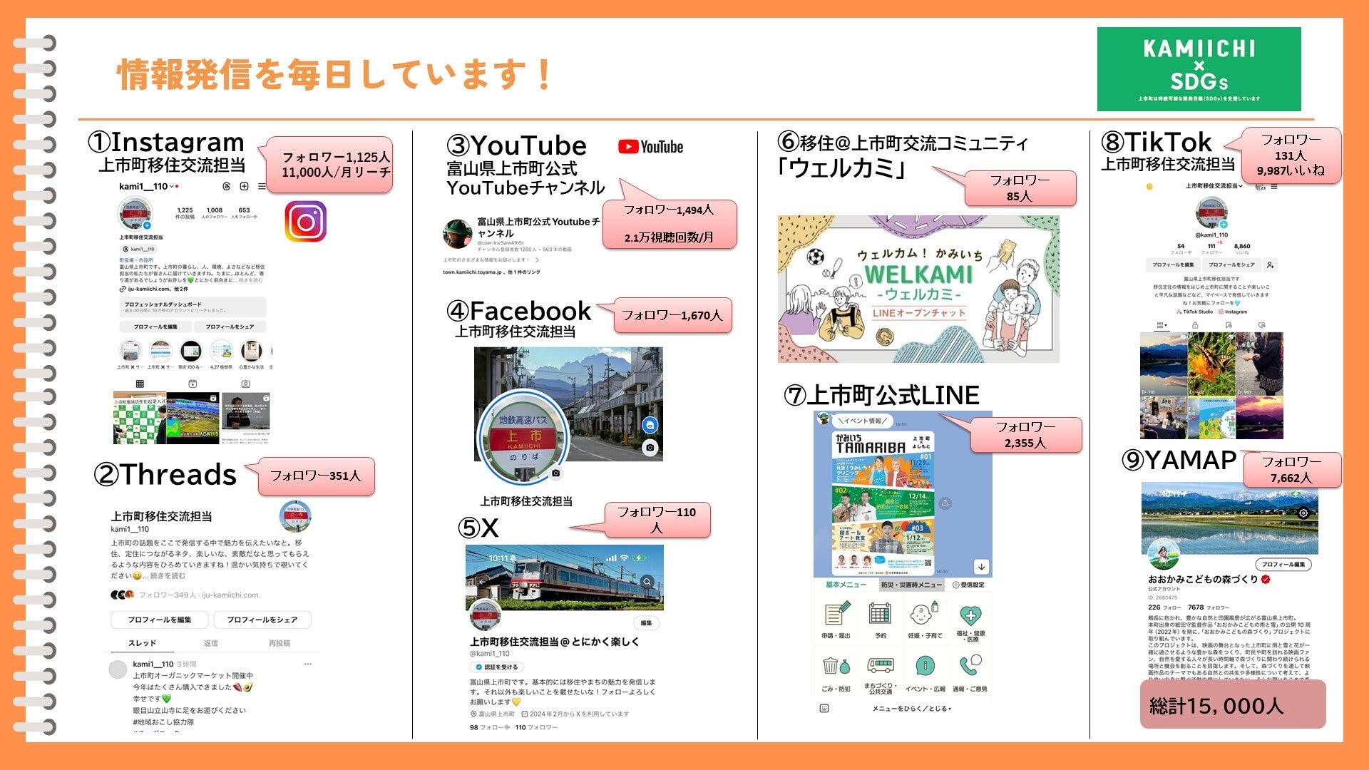 数年前、町の情報は主に「広報かみいち」を通じて発信されていました。しかし、ちょっとしたことでも、もっと広く発信すべきだと思い、移住担当者としてSNSを活用して毎日情報を発信し始めました。最初は「行政らしくない言い回しだ」「誰がチェックするのか、毎日続けられない」と言われましたが、私は自分を励まし、とにかく小さな出来事も拾い上げて発信し続けてみました。