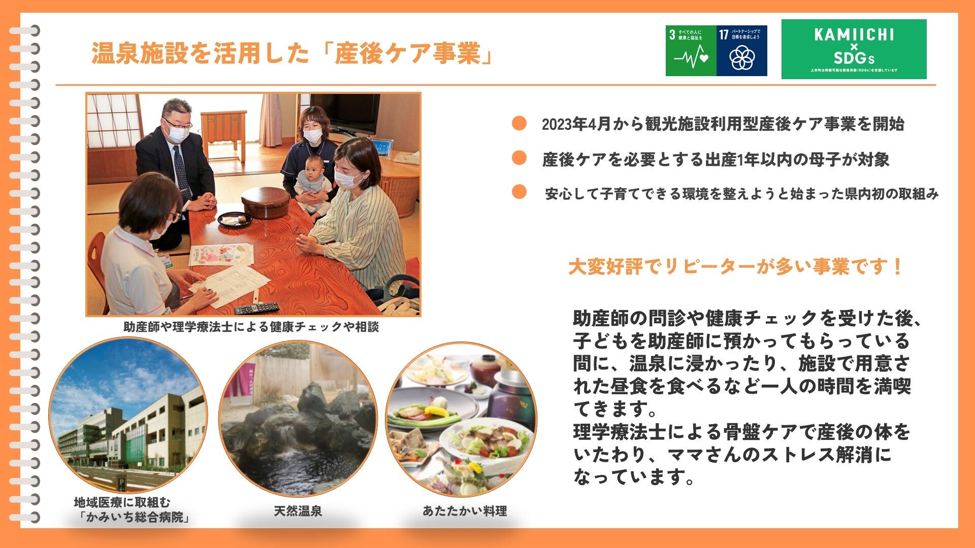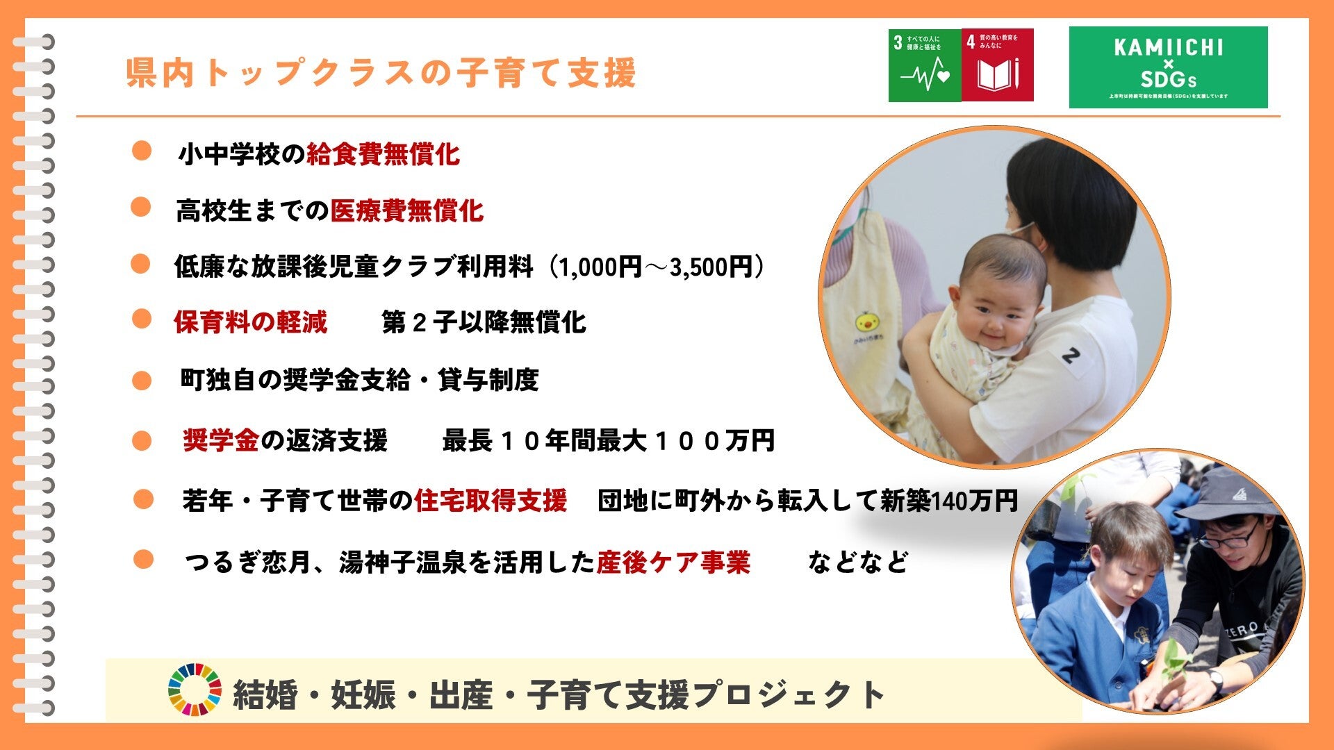 小中学校の給食費無償化、町独自の奨学金支給や返済支援、温泉施設での産後ケア、高校生年代までの医療費無償化、おむつ無料券の配布といった新しい事業を打ち出し、令和7年度からは新たに第2子保育料の無償化も実施する予定です。