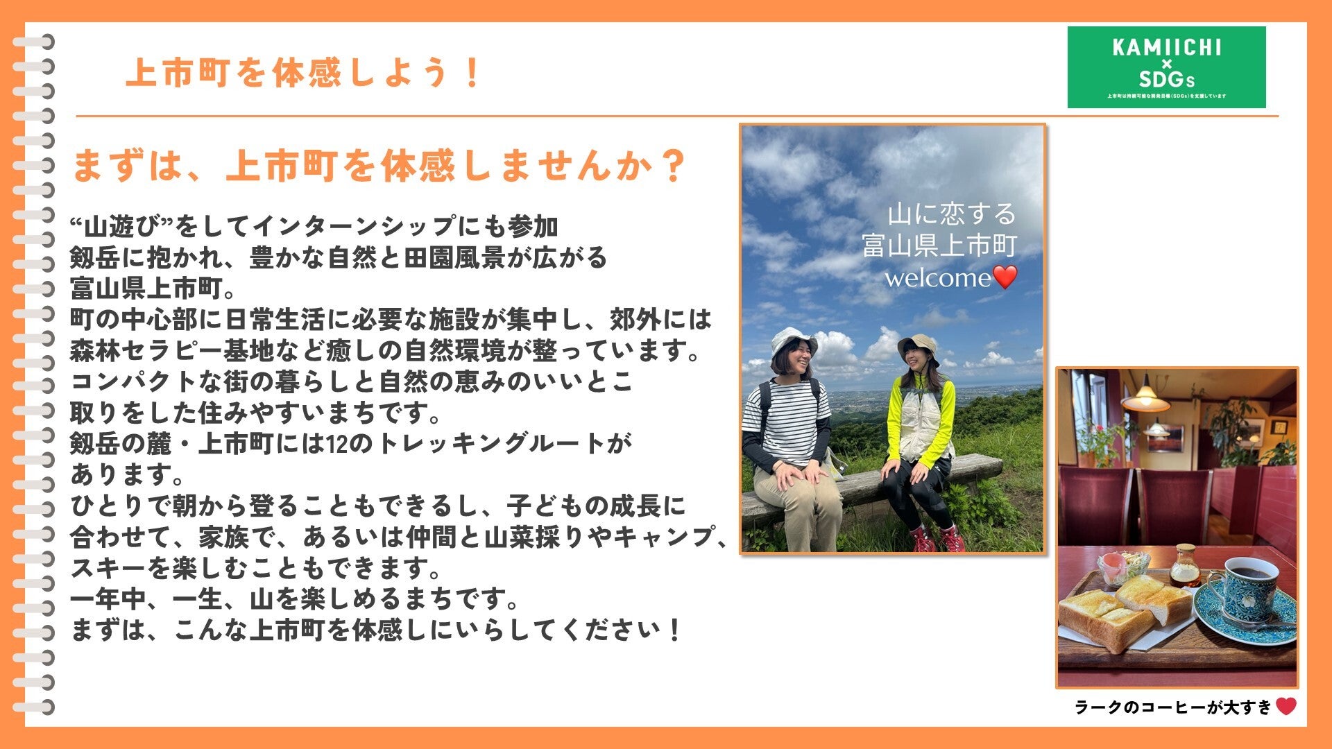 また、移住体験としてオススメしたいのが、まちの生活を体験できる「上市暮らし体感プログラム」です。実際に移住してきた地域おこし協力隊が案内し、まちの人や事業所を紹介します。温かいコミュニティを実感し、移住後の生活がどれだけ楽しく充実するかを体験できます。