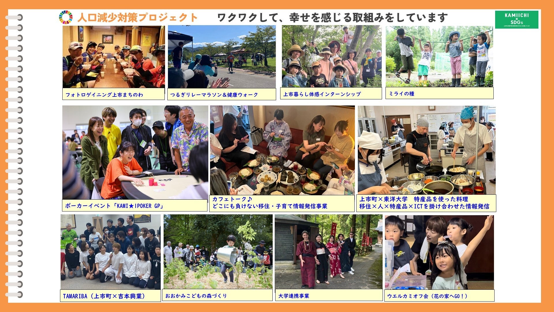 「フォトロゲイニングⓇ上市まちのわ」「つるぎフェスティバルinかみいち」「eケーションinかみいち」「まちづくりポーカー大会」「おおかみこどもの森づくり植樹祭」「ミライの種」「吉本興業の芸人さんとのTAMARIBA」など、地域の事業所や住民、子どもたちと連携して開催してきました。これらのイベントは、時代に合うようにアップデートされ、まちの活気を感じることができます。