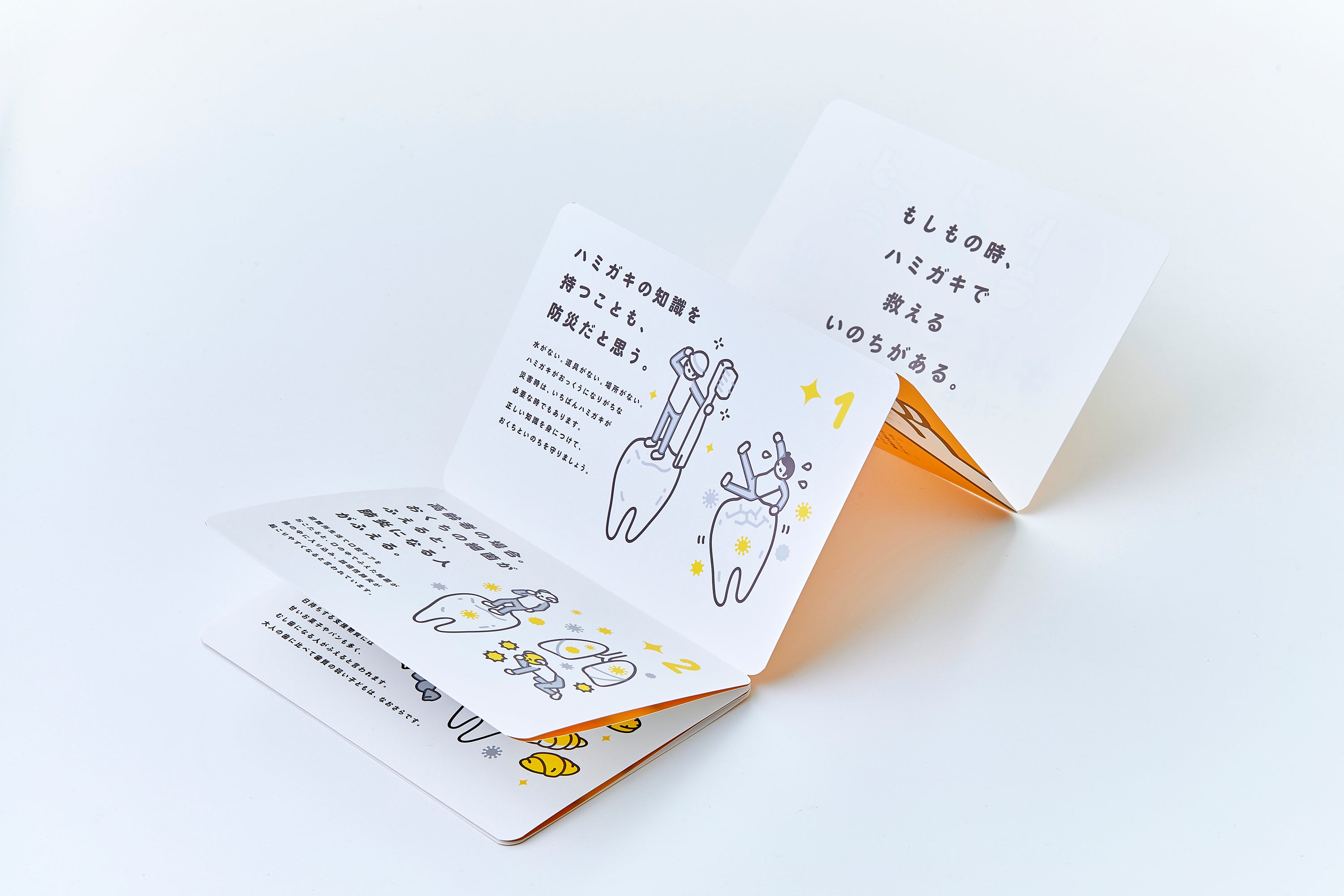 総ページ16p(※表裏表紙含む)のリーフレットで、ハブラシ・フロス・ハミガキシートの使い方の他に、歯みがきが出来ない事でどんなリスクがあるかについて、子供からお年寄りまで楽しく学べるイラストと分かりやすい文章でお伝えしています。
