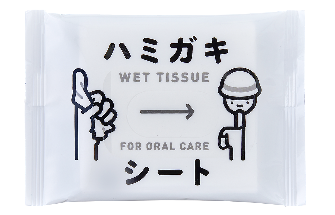お口を水でゆすぐ代わりにハミガキシートで汚れをふき取ります。ハミガキシートにはキシリトールが入っていますので、お口の中がスッキリします。また、頬の内側や歯茎をマッサージする事で血流や唾液の分泌を促進する事が出来ます。