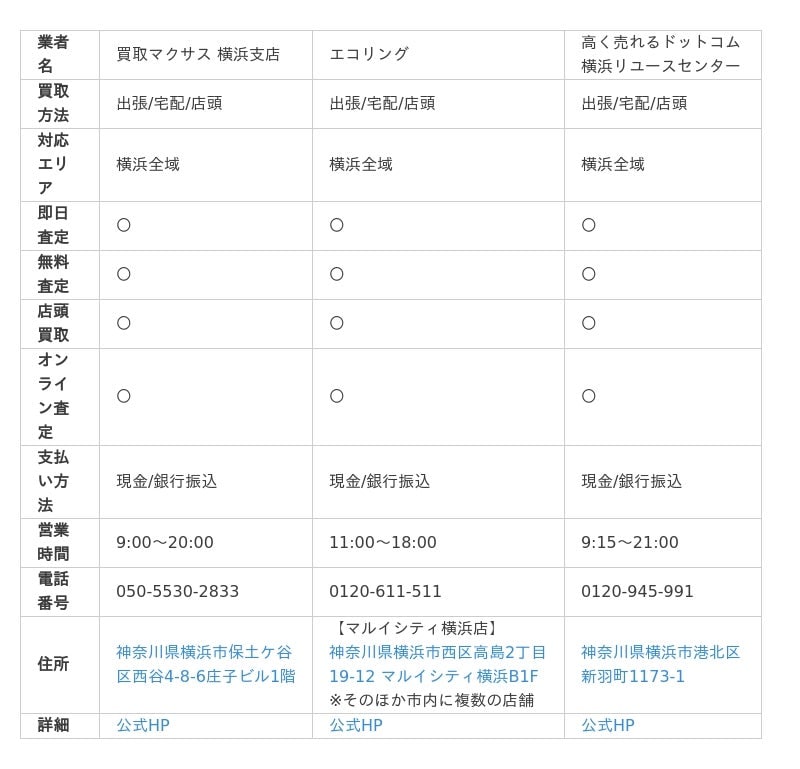 横浜でおすすめの出張買取業者は以下のとおりです。