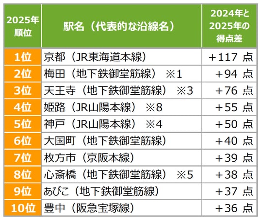 「梅田」が4年連続で1位/得点ジャンプアップランキング1位は「京都」/穴場な街として「桂」「大国町」が初めてトップ5にランクイン