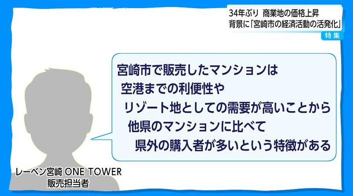 また、タワーマンションの販売担当者によると、宮崎市で販売したマンションは、空港までの利便性や、マリンスポーツやゴルフなどを楽しめるリゾート地としての需要が高いことなどから、他県のマンションに比べて県外の購入者が多いという特徴があるという。