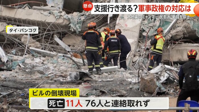 ミャンマーの隣の国でも被害が出ている。タイの首都バンコクのビル倒壊現場では、これまでに11人が死亡し、76人と連絡が取れていない。